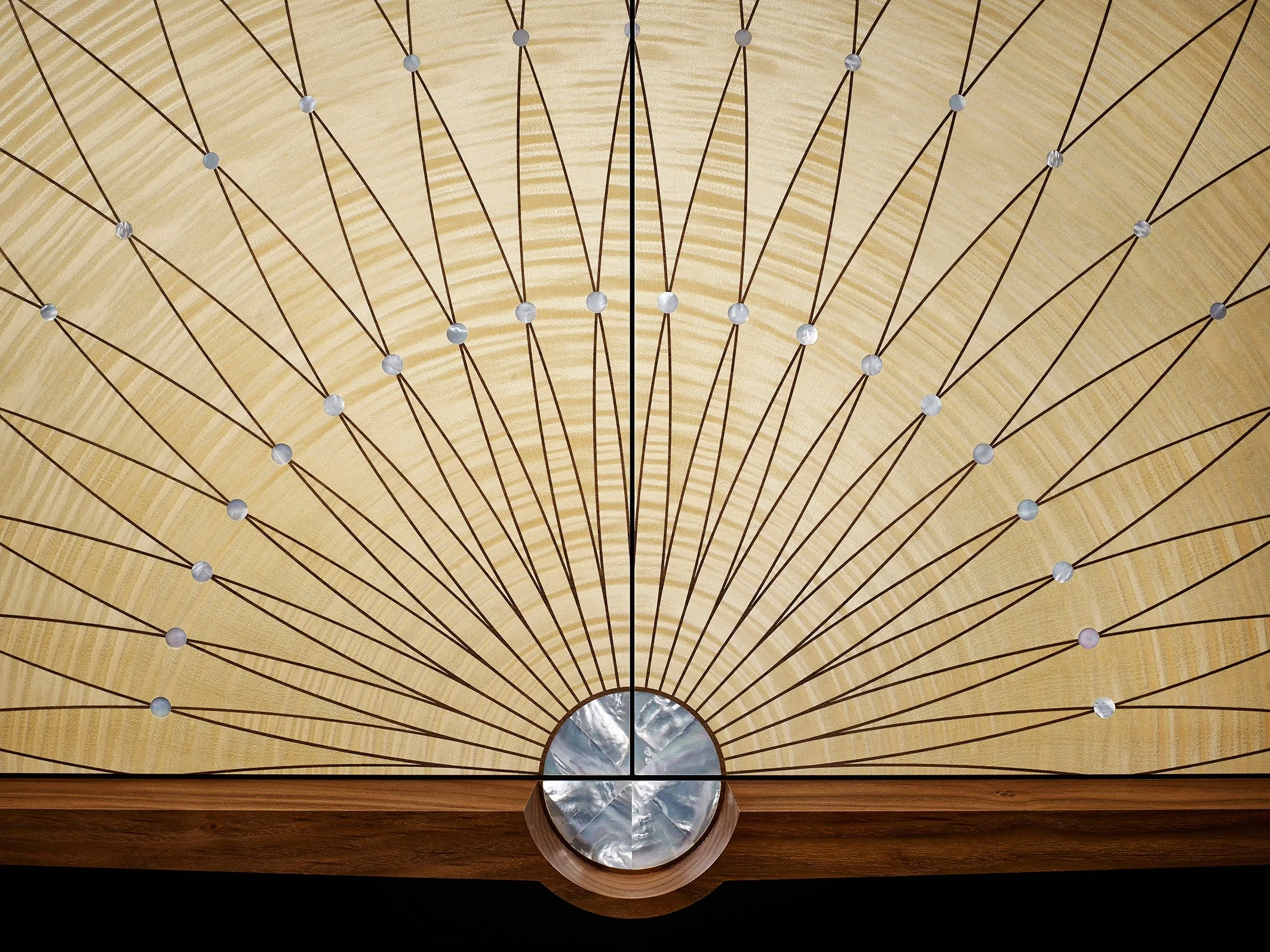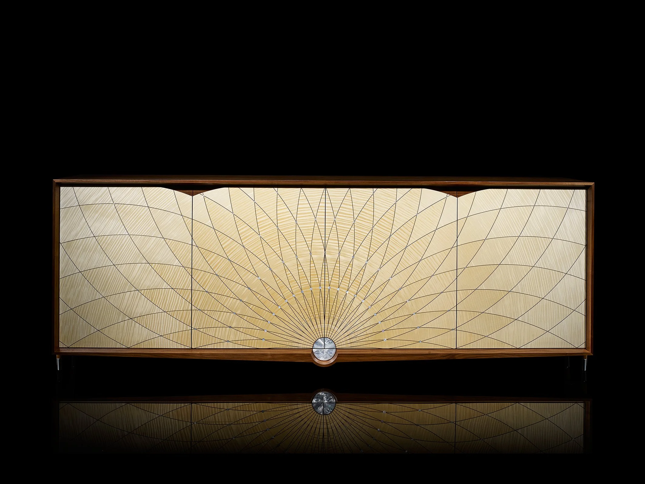 The Fibonacci Cabinet takes this principle as its starting point. Rippling sycamore marquetry unfolds across the surface in warm ochre tones, echoing the colour and structure of a sunflower head. The arrangement of the veneers follows the same geometric progression found in nature, creating a surface that feels both ordered and organic.