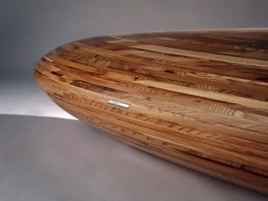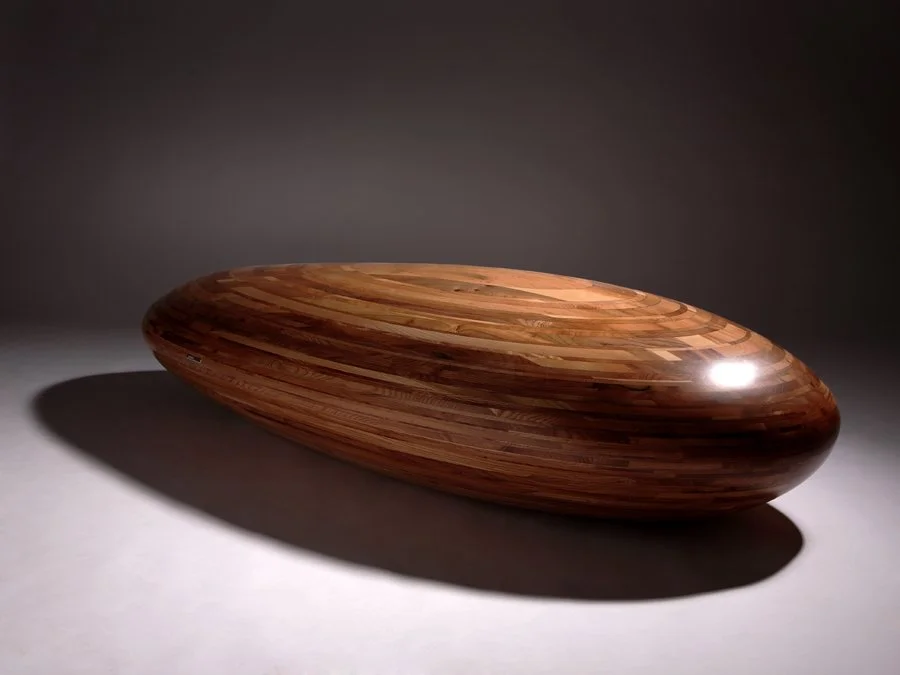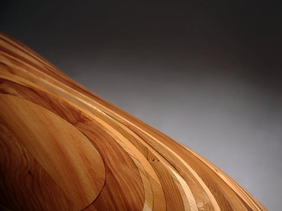 To achieve this form, layers of English elm were laminated together and carefully shaped. The visible lamination lines across the surface echo geological stratification, revealing the structure of the piece while reinforcing the organic form.