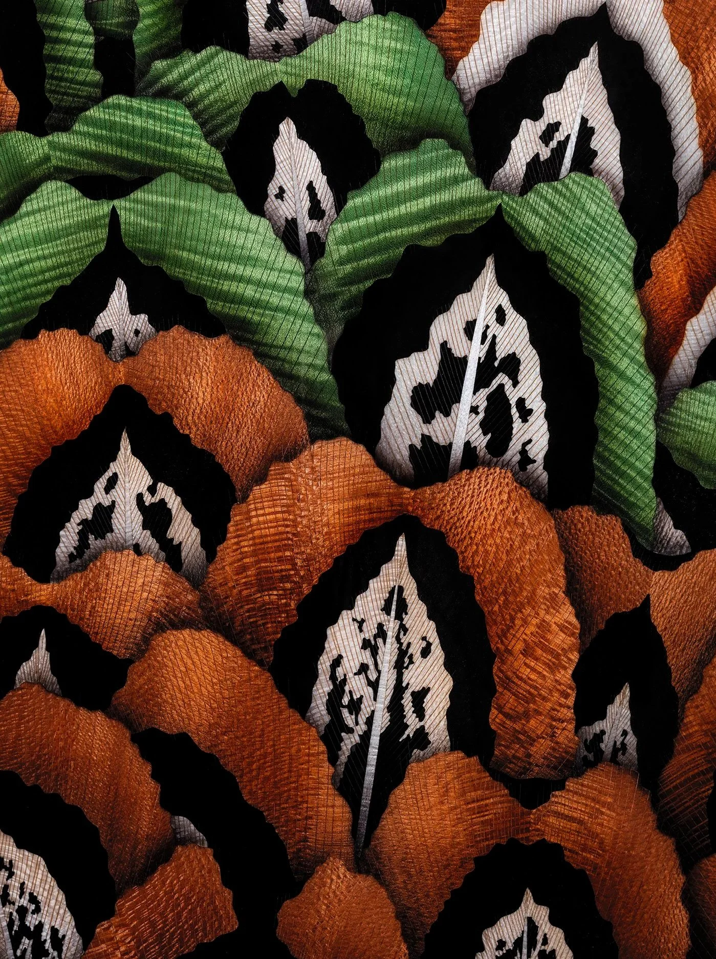 To recreate this effect, Silverlining's leather workshop developed a stack-lamination technique using repurposed coach-hide leather. Layers are built up and sculpted to reveal shifting bands of colour and depth, echoing the canyon's natural formations. Diagonal sculptural handles appear to emerge from the surface, reinforcing the sense of movement through the layered form. Where geological forces shape landscapes over millennia, nature also creates intricate structures at a smaller scale - in feathers, shells, and the growth patterns of living things.