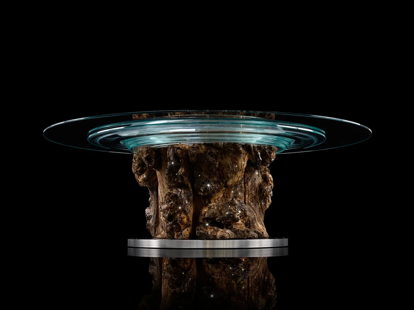 A sculptural pedestal carved from the burred base of the oak rises above a polished stainless steel plinth. Above it sits a circular aquamarine cast glass top, while a central bowl turned from a fifty one kilogram block of burr oak anchors the composition. One hundred and sixty micro LED lights were inserted by hand into the pedestal, illuminating the complex figure of the burr.