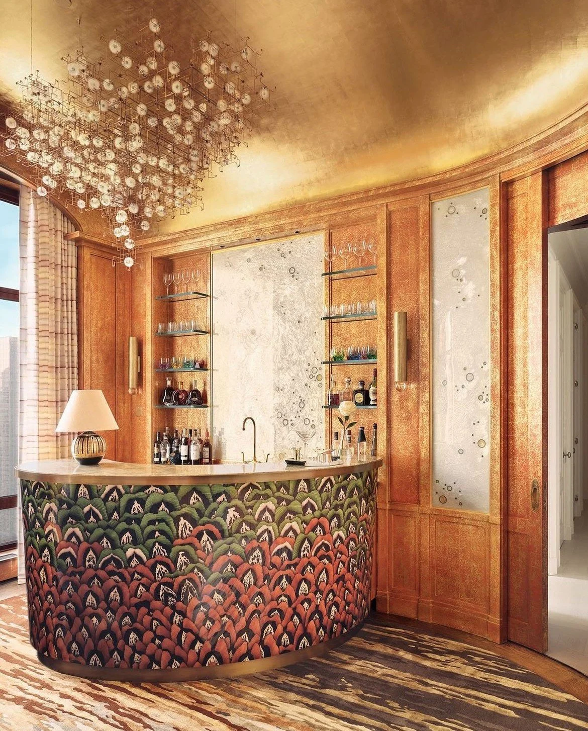 It might just be a bar that designer Brian McCarthy recently created on an upper floor of a Park Avenue high-rise. The cocooning room, its arched floor-to-ceiling window framing a glittering downtown view, is lined in gold-dappled, coral-lacquer paneling with insets of swirling, smoky resin embellished with bronze details.